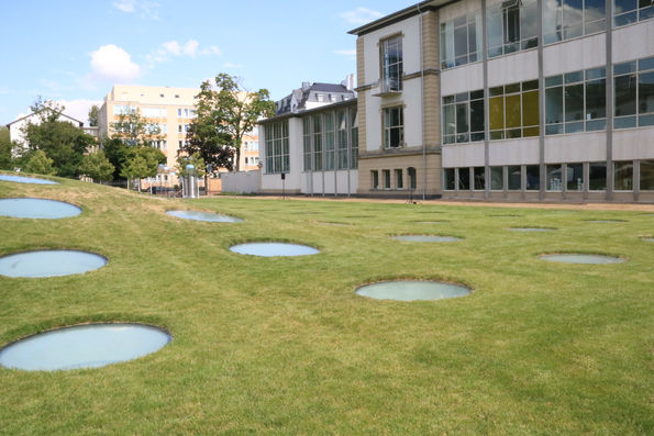 La superficie exterior de la losa de techo doblemente curvada está cubierta por un total de 195 tragaluces, que varían en diámetro de 1,50 m en el borde exterior a 2,50 m en el punto más alto en el centro. Estos ojos de luz fueron desarrollados especialmente para la extensión Städel y están diseñados para caminar sobre ellos. La luz del día que entra en el espacio de exposición se puede controlar; ya sea aumentándola usando el sistema de iluminación LED integrada o mitigándola por elementos de sombreado integrados en la luz del techo.